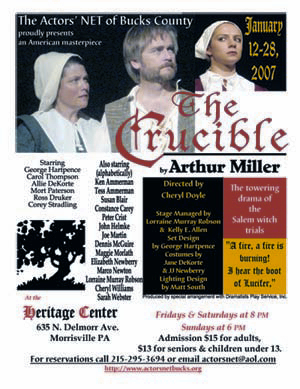 The Crucible is a 1953 play by American playwright Arthur Miller. It is a dramatized and partially fictionalized story of the Salem witch trials that took place in the Massachusetts Bay Colony during 1692-93. Directed by Cheryl Doyle.